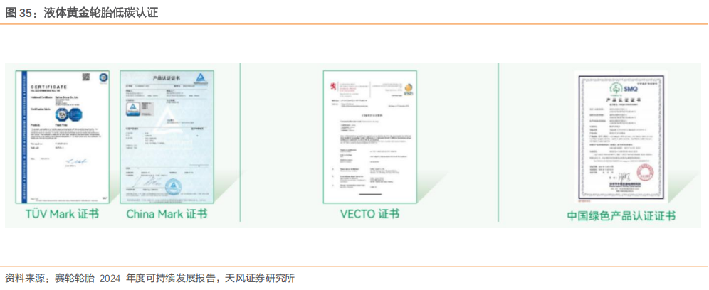 德国TÜV莱茵对液体黄金轮胎开展的产品碳足迹核查结果显示,每行驶1,000公里,液体黄金卡客车轮胎和乘用车轮胎的全生命周期碳排放量比同规格普通轮胎下降39%和27%。基于卓越的环保表现,液体黄金轮胎产品获得了由卢森堡权威机构SNCH(Société Nationale de Cerification et d'Homologation)颁发的(EU)2017/ 2400二氧化碳排放和燃油消耗证书。