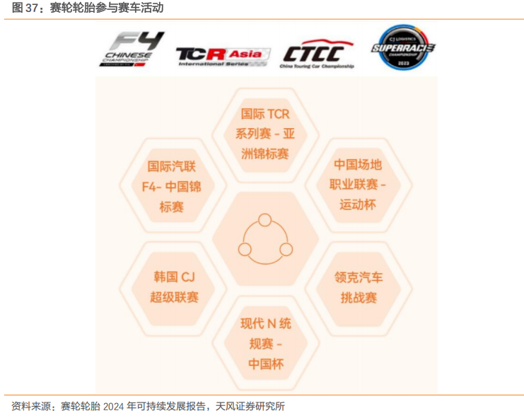 得益于多年来对橡胶的基础研究成果,赛轮的赛事轮胎在操控性、抓地力、稳定性上均达到了世界级水平,为赛车手提供更高安全性和更优驾驶体验,为精彩汽车赛事赋能中国速度。2024年2月,赛轮集团正式获得FIA认证,成为唯一一家拿到职业汽车赛事入场券的中国本土轮胎品牌。自2024赛季开始,公司为多个国际顶级赛事独家提供赛事轮胎。此外,公司长期以冠名、赞助的形式助力各大竞速比赛,在竞速领域持续发挥“赛轮影响力”。