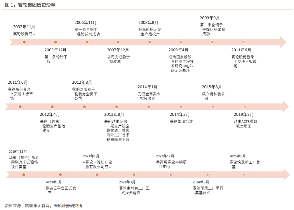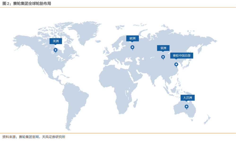 赛轮集团前身青岛赛轮子午线轮胎信息化生产示范基地成立于2002年,是国家橡胶与轮胎工程技术研究中心科研示范基地,同时也是国内首家集新材料、新技术、新装备、新工艺、新管理模式于一体的信息化生产示范基地。集团以“做一条好轮胎”为使命,致力于为全球轮胎用户提供更优质的产品与服务,以先进的技术推动橡胶轮胎行业高质量发展。公司在中国的青岛、东营、沈阳、潍坊及海外的越南、柬埔寨、墨西哥、印尼建有轮胎生产基地,埃及、沈阳新和平生产基地计划启动建设。公司产品销售覆盖中国、北美、欧洲、亚洲、非洲等全球180多个国家和地区。