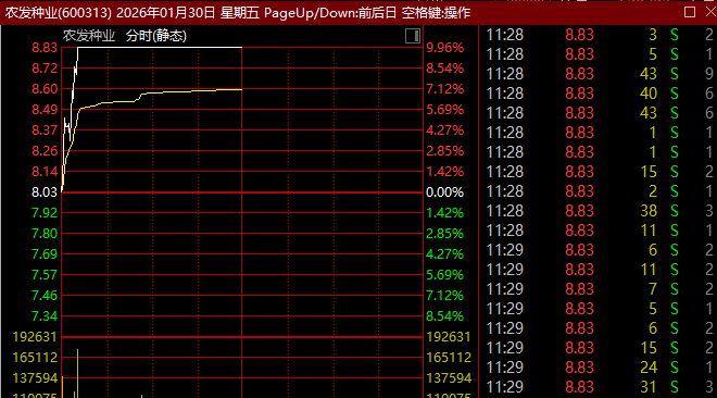 农林牧渔概念股早间集体逆市走强,种业方向走势尤其迅猛,板块指数一度放量飙升逾10%,创近10个月新高,开盘不到1小时成交超昨日全天成交。板块内所有个股上涨,农发种业(600313)开盘仅约10分钟涨停,近3个交易日2度涨停,秋乐种业、神农种业、登海种业等也强势涨停或涨超10%。