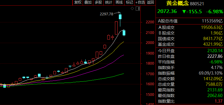 黄金概念股早间大幅退潮,板块指数低开低走一度重挫逾7%,创近10个月来最大跌幅。板块内个股现跌停潮,晓程科技20%跌停,萃华珠宝、白银有色、豫光金铅、四川黄金等多股开盘跌停,曼卡龙、鹏欣资源、赤峰黄金等超30股跌停或跌超10%。