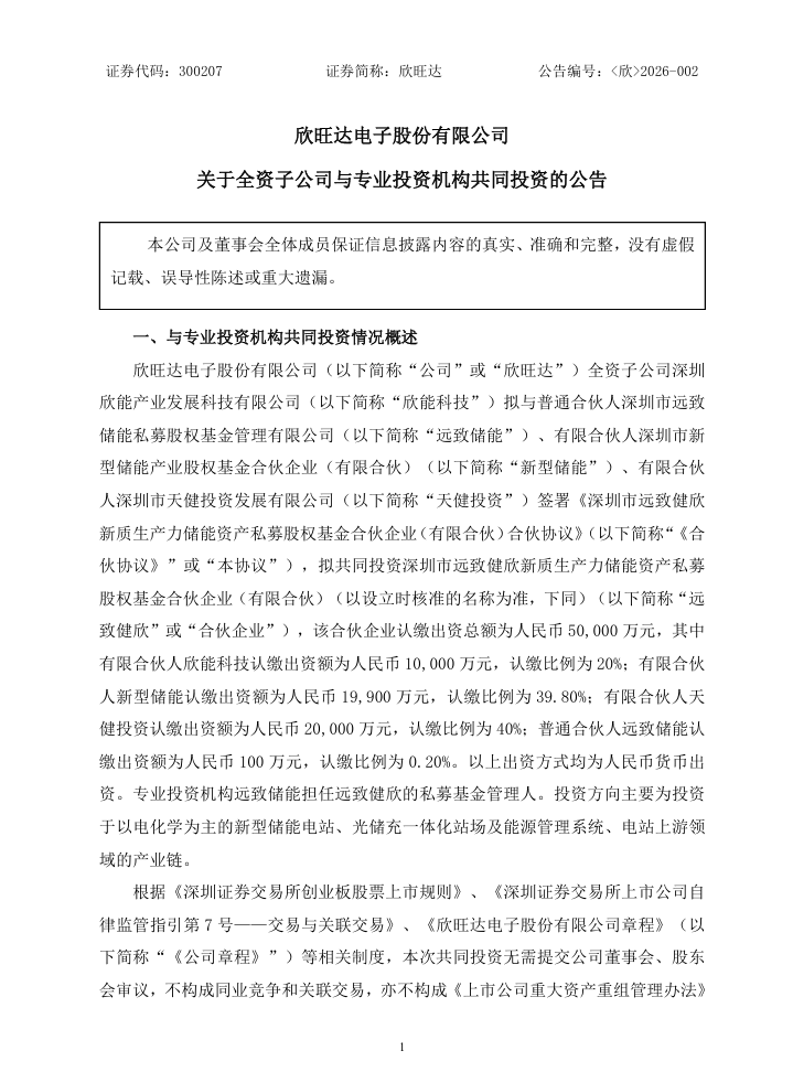 早在2025年9月,欣旺达全资子公司前海弘盛拟与远致储能、储能产业基金、港华能源签署《深圳市远致港欣智慧能源产业投资私募股权基金合伙企业(有限合伙)合伙协议》,共同投资深圳市远致港欣智慧能源产业投资私募股权基金合伙企业(有限合伙)。