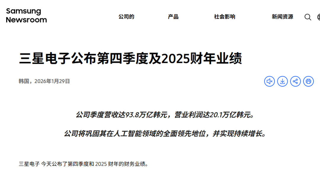 第四季度作为业绩爆发期,三星电子单季营收达93.8万亿韩元,环比增长9%、同比增长24%;营业利润20.1万亿韩元,同比激增208%,创下单季营业利润历史峰值;净利润19.64万亿韩元,同样表现亮眼。