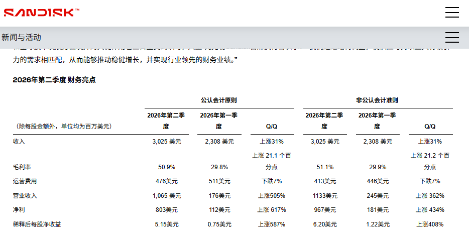 根据官方披露的数据,闪迪在2026财年第二季度实现了30.25亿美元的营收,较去年同期的18.76亿美元大幅增长61.2%。在利润表现方面,按照美国通用会计准则(GAAP)计算,闪迪该季度净利润达到8.03亿美元,增长了672%;摊薄后每股净利润(EPS)为5.15美元,而去年同期仅为0.72美元,同比增长615%。