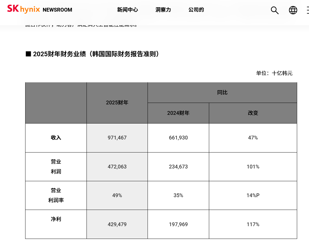 SK海力士表示,此次业绩远超2024年创下的历史最高记录。营收同比增长逾30万亿韩元,营业利润也实现翻倍增长,刷新了历史最高年度业绩。