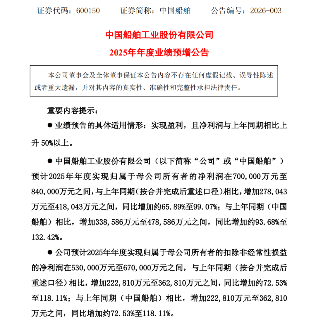 根据公告内容,经公司财务部门初步测算,预计中国船舶2025年年度实现归属于母公司所有者的净利润在70亿元至84亿元之间,与上年同期(按合并完成后重述口径)相比增加约65.89%至99.07%,与上年同期(中国船舶)相比增加93.68%至132.42%。