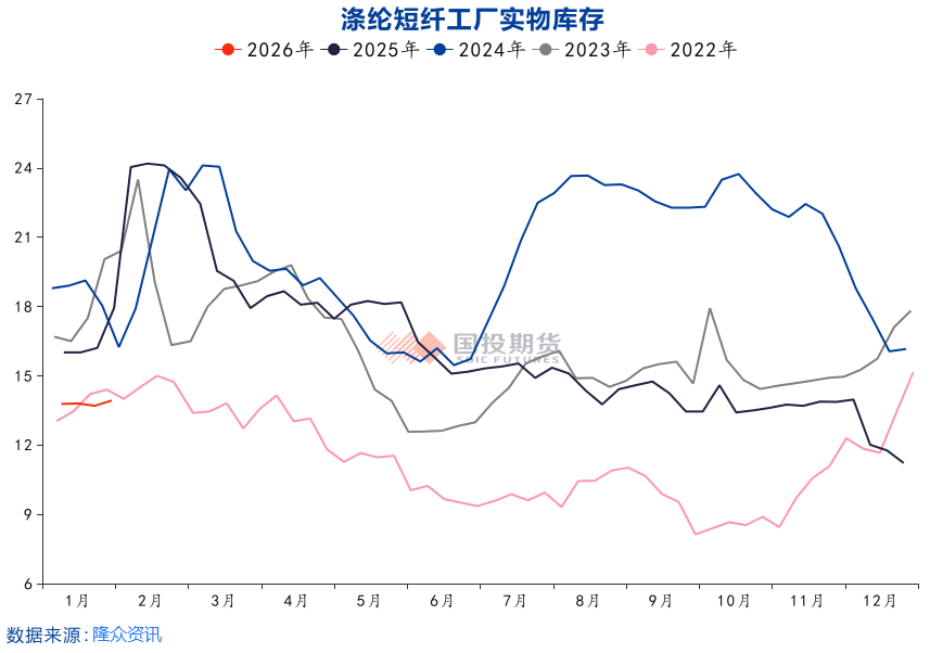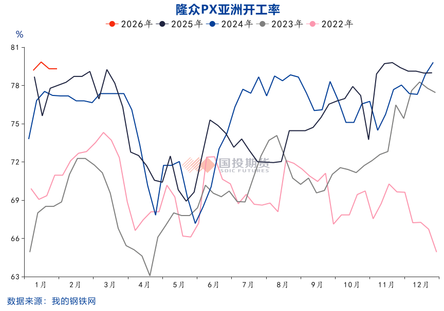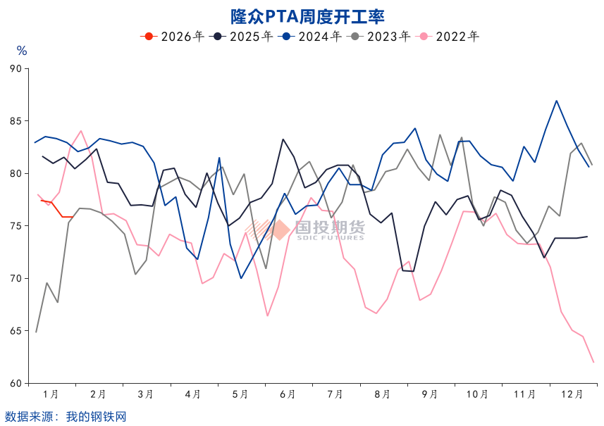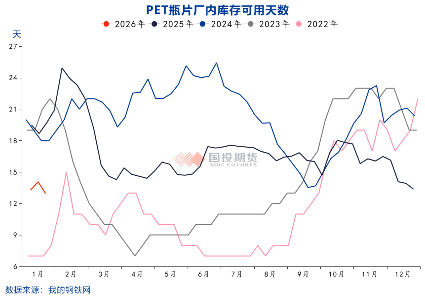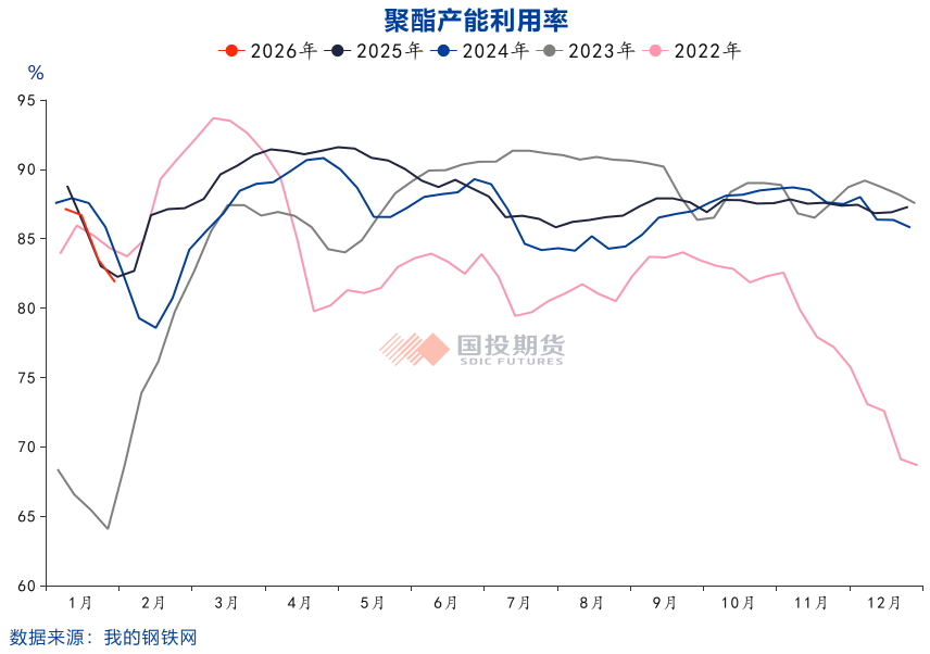 聚酯负荷下降导致需求持续萎缩。1月中旬开始,PTA由去库转为累库,且下游预期在春节之后视效益情况决定重启进度,累库将延续至节后,但具体的时点受PTA负荷及聚酯负荷变动会有变化。