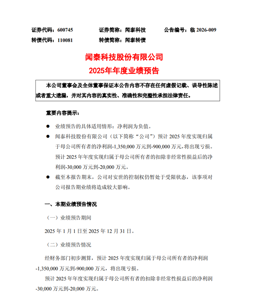 1月30日,闻泰科技发布2025年业绩预告。全年实现归属于母公司所有者的净利润预计为-135亿元至-90亿元,扣除非经常性损益后的净利润预计为-3亿元至-2亿元。上一年同期公司利润总额为-19.11亿元,实现归属于母公司所有者的净利润为-28.33亿元,归属于母公司所有者的扣除非经常性损益后的净利润为-32.42亿元,每股收益为-2.28元/股。