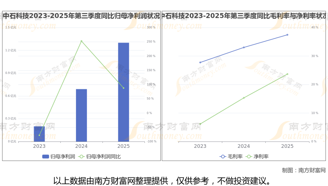 中石科技2025年第三季度季报显示,公司实现净利润1.3亿,同比增长87.74%;毛利润为2.06亿,毛利率37.46%。
