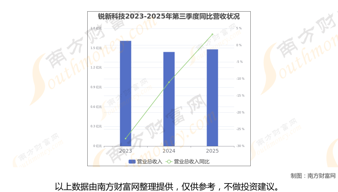 在2025年第三季度,锐新科技的业绩表现(如上图),主营业务收入达到1.48亿元,实现了3.25%的同比增长率。