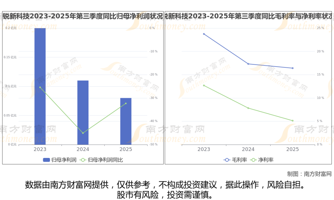 锐新科技2025年第三季度季报显示,公司实现净利润760.87万,同比增长-32.32%;毛利润为2432.44万,毛利率16.41%。