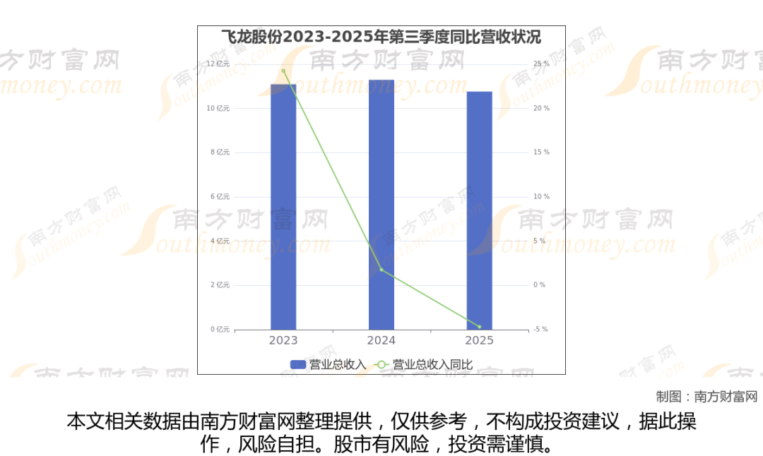 飞龙股份2025年第三季度报告显示(如上图),公司实现主营业务收入10.76亿元,较去年同期增长-4.68%。