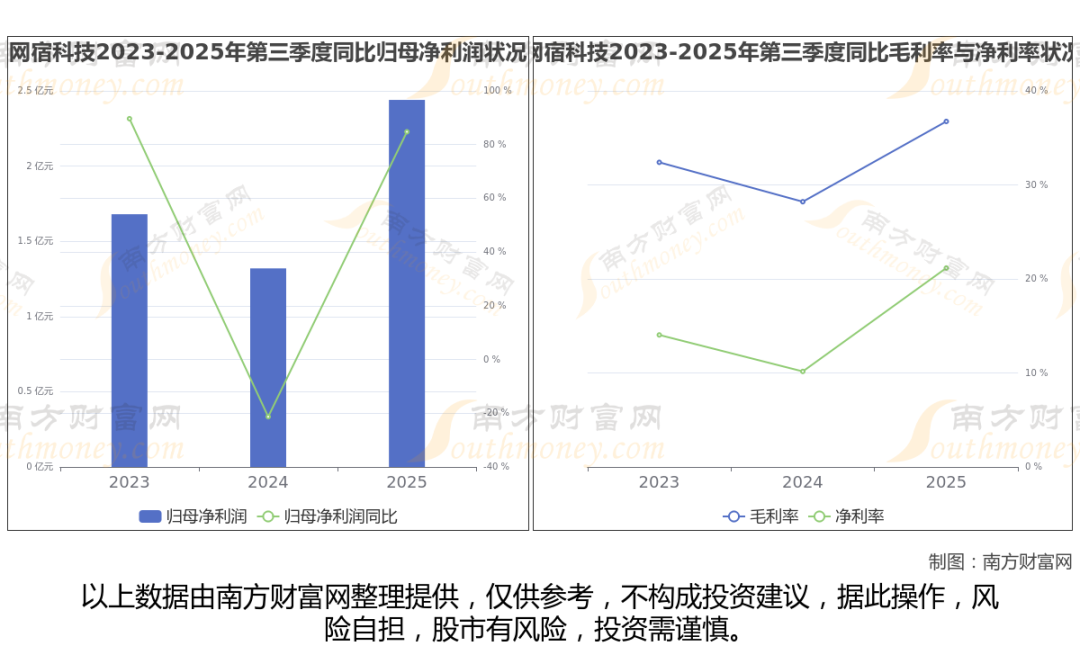 2025年第三季度季报显示,网宿科技公司实现净利润2.44亿,同比上年增长率为84.77%,毛利率36.75%,归属净利润2.44亿,同比增长84.77%。
