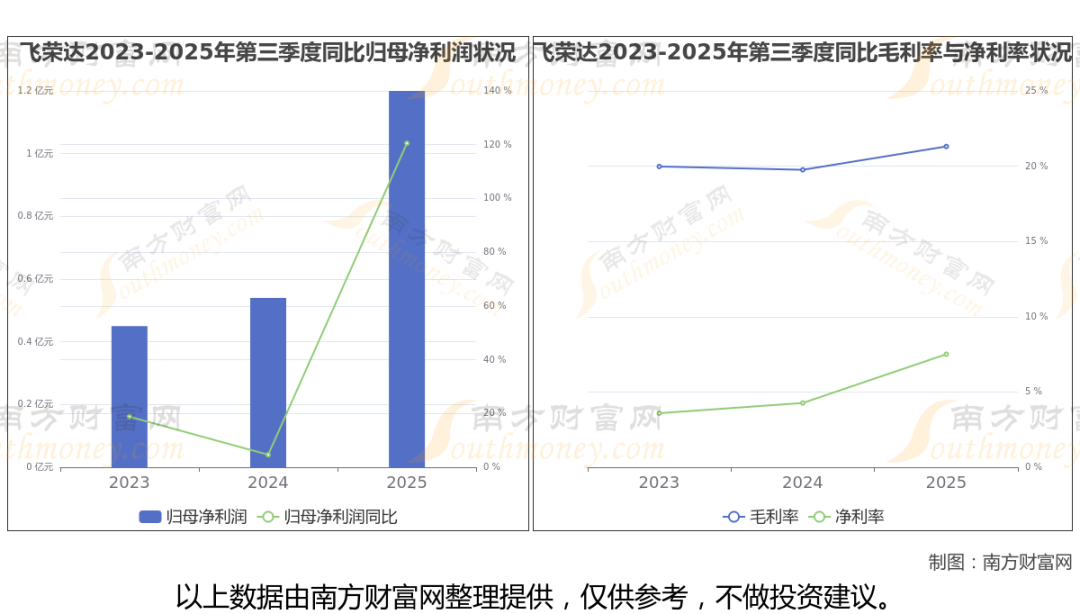2025年第三季度季报显示,飞荣达公司实现净利润1.2亿,同比增长120.52%;毛利润为3.7亿,毛利率21.31%。