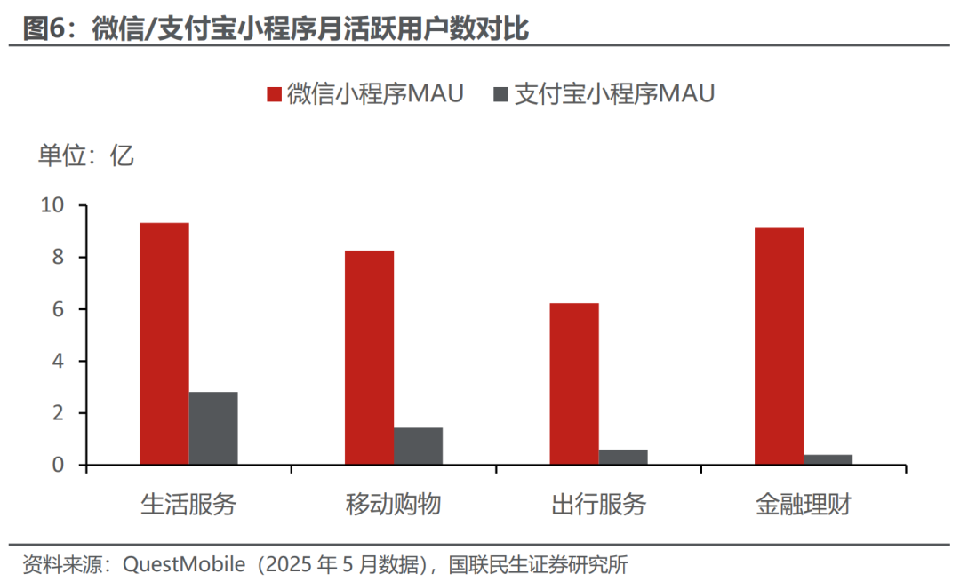 QuestMobile数据显示,截至2025年5月,小程序用户规模排名前十的行业均已突破2亿用户。其中,生活服务、金融理财、出行服务、移动视频、医疗健康、在线教育等行业均实现同比增长,凸显了小程序广泛的场景渗透力。其中,生活服务、移动购物、出行服务等适合于接入Agent场景,微信小程序均具有强大月活用户规模优势,显著超过支付宝小程序用户,应用场景潜力巨大。