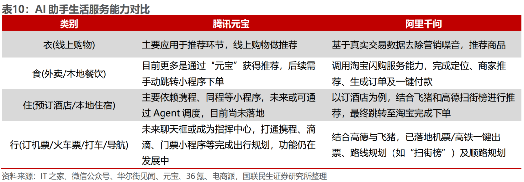 社交&工作场景下,腾讯依托社交与内容的入口心智,元宝作为微信首个AI好友增强触达。生活&服务场景下,腾讯“微信 小程序 支付”闭环完备,但端内由AI直控交易的形态仍在迭代推进。
