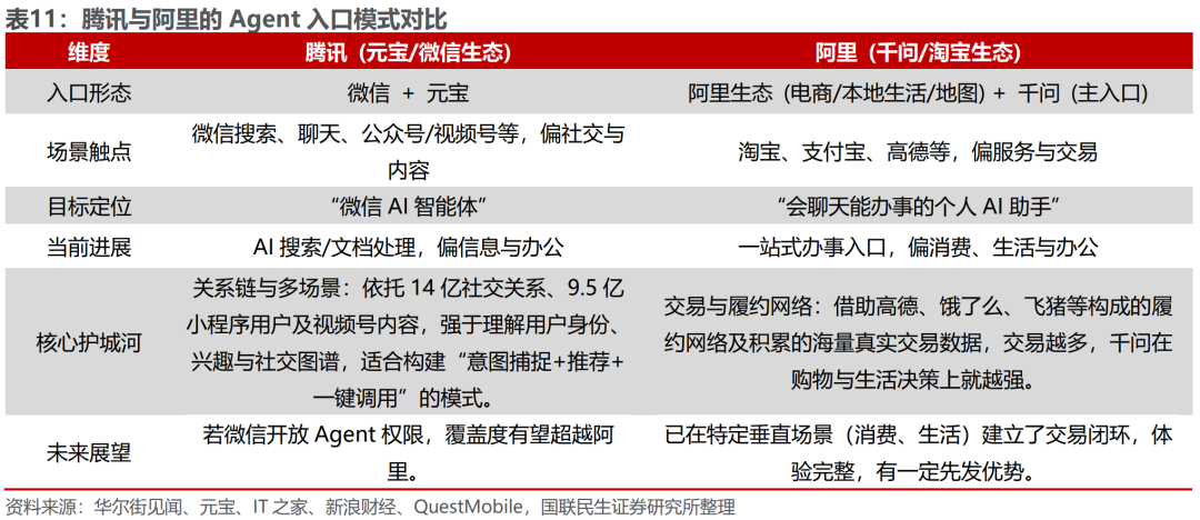 相较于阿里的交易履约能力,腾讯依靠关系链和多场景作为核心优势,两者的C端护城河形态不同。阿里借助高德、饿了么、飞猪等构成履约网络并积累交易数据,越多真实交易,千问的AI购物与生活决策就越强。