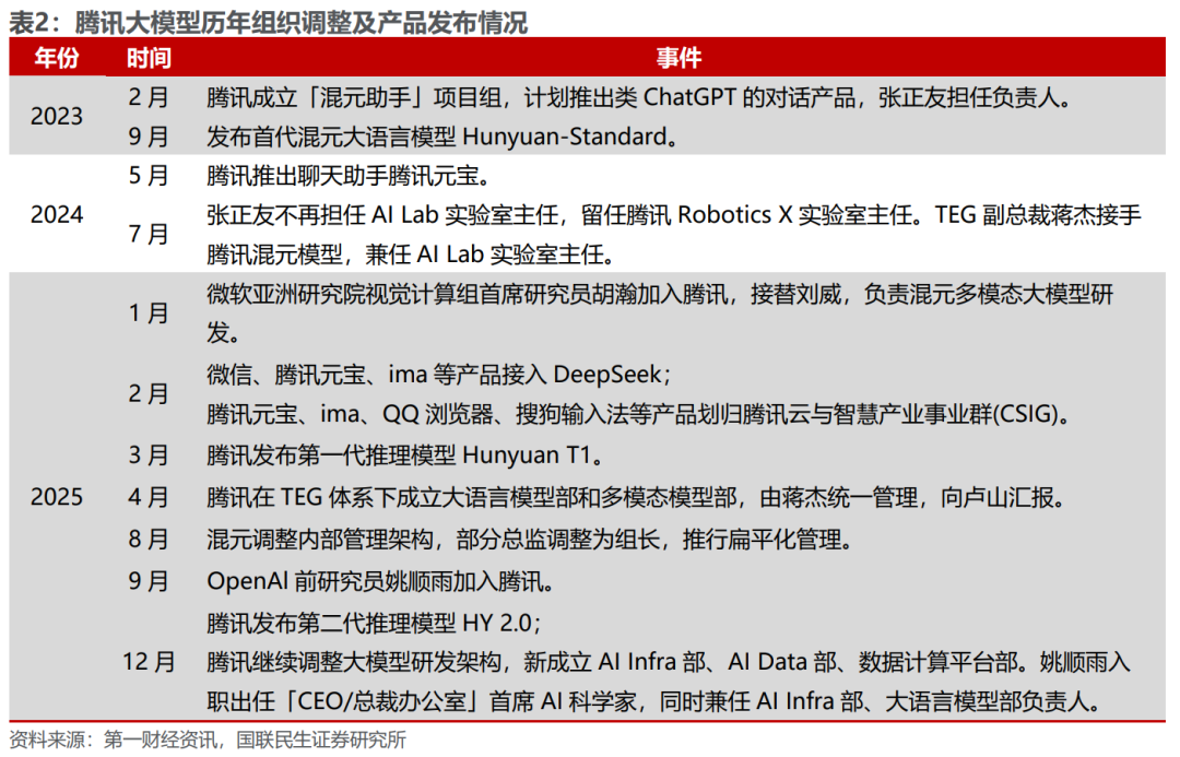 2025年12月,腾讯宣布混元大模型研发架构升级,设AI Infra/AI Data/数据计算平台部,全面强化其大模型的研发体系与核心能力。姚顺雨出任“CEO/总裁办公室”首席AI科学家,向腾讯总裁刘炽平汇报;同时兼任AI Infra部、大语言模型部负责人,向技术工程事业群总裁卢山汇报,推进模型-工程-数据一体化。