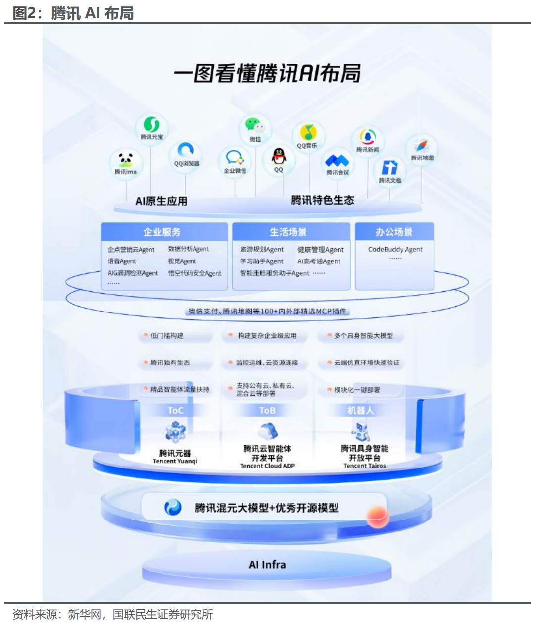 3)应用层:升级原有业务,同时拓展AI原生新场景,在接入AI提升现有产品效率及竞争力的同时,探索新的用户需求及应用场景:1)核心产品AI升级:将AI能力接入微信、QQ、企业微信、腾讯会议、腾讯文档等产品,全面提升内容生产、开发及企业办公效率,持续优化用户体验和参与度。2)原生AI产品方面,包括元宝、ima。元宝是基于自研混元和DeepSeek R1等顶尖模型的C端AI助手,提供AI搜索、AI总结、AI写作等丰富的AI能力。ima是以知识库为核心的AI工作台,提供精准检索、高质量AI问答及文本创作辅助,提升知识管理效率与内容创作生产力。