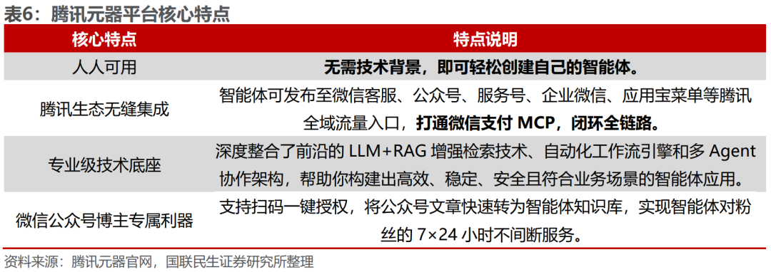 其核心优势在于:能够深度对接微信生态,智能体可发布至腾讯全域流量入口,同时打通微信支付MCP,通过将十亿级社交用户转化为流量池,降低智能体获客成本,实现AI应用的便捷分发和支付闭环。