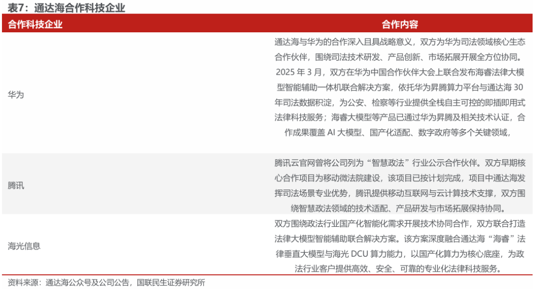 2025年3月,公司与华为联合发布"海睿法律大模型智能辅助一体机",搭载华为昇腾芯片,理论峰值算力256TOPS,支持DeepSeek、Qwen等国产开源大模型;采用本地私有化部署,为公安、检察、仲裁等行业客户提供安全高效、即插即用的法律科技服务;实现智能审讯、辅助、智能审查辅助、类案推荐、量刑建议等功能;已中标深圳、陕西等地G端项目,产品性能较竞品进一步提升。