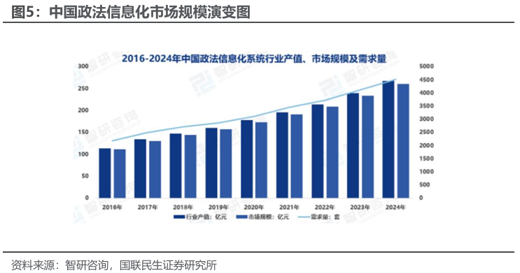 据智研咨询统计及测算,2023 年,我国政法信息化系统需求量由 2016 年的 2180 套增至 4114 套,市场规模从 111.07 亿元提升至 233.9 亿元,行业产值由 113.78 亿元增长至 239.56 亿元;2024 年,其需求量预计达 4520 套,市场规模将达 260.8 亿元,行业产值将达 4520 亿元。未来,伴随大数据、云计算、人工智能等技术的深度应用,政法信息化系统将持续完善创新,加速我国司法体系现代化与数字化转型,市场增长潜力巨大。