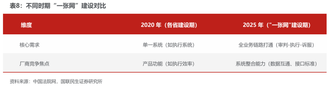 通达海作为国内司法信息化领域的重要服务商,正经历从“单一系统供应商”向“一体化平台服务商”的战略跃迁。这一转型深刻映射了行业需求与竞争格局的结构性变化:在 2020年以前的各省建设期,法院信息化的核心需求集中于单一系统功能建设,如执行、审判系统,厂商竞争焦点在于产品功能的深度与效率;而至 2025年“全国法院一张网”全面推进阶段,需求已升级为全业务链路贯通:审判-执行-诉服一体化,竞争核心也转向系统整合与生态协同能力,尤其是数据互通、接口标准化及持续运维服务。