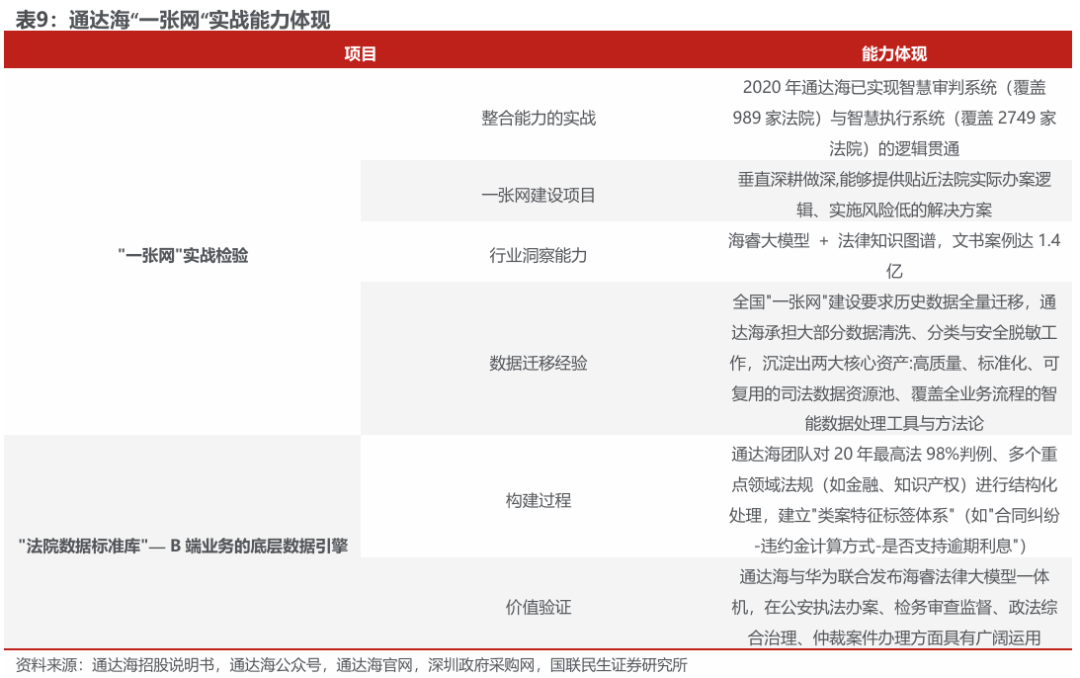 高壁垒的G端数据飞轮:不同于通用模型仅依靠公开文书训练,通达海占据了司法数据的源头,经过了数十年法院核心办案系统的打磨与沉淀。从“立案-审判-执行”的全流程数据 司法知识图谱构建自身核心数据壁垒,掌握着详实的知识图谱与文书规则库(如电子卷宗、执行线索等)。