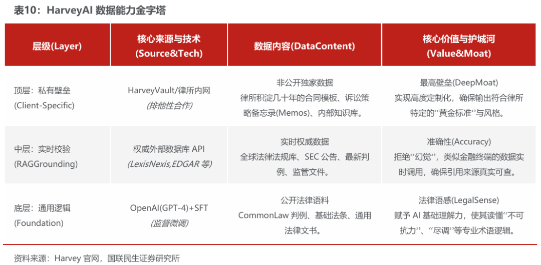 高壁垒的数据飞轮:不同于通用模型,Harvey经过了大量法律专有文本(判例、合同、法条)的Fine-tuning(微调),从律师内网 权威外部数据库 公开数据库构建自身核心数据壁垒。