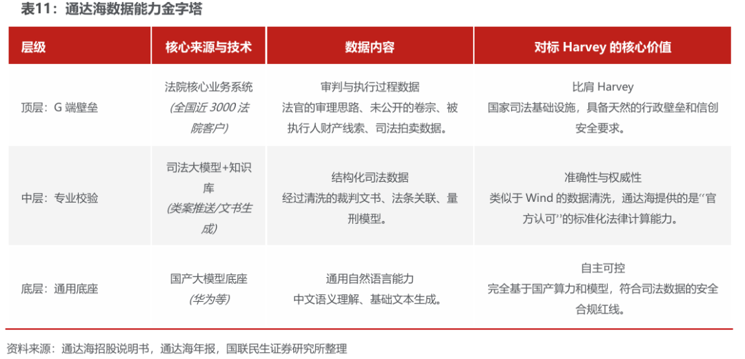 Harvey AI 开启法律科技“黄金时代”,通达海独占更强“数据特权”。美国法律AI独角兽Harvey AI近期估值迅速提升至80亿美元,其成功核心在于打造了法律界的“Bloomberg模式”—即通过独占的高质量法律数据和极高的迁移成本,向高价值律师收取高昂年费。在AI时代,法律行业正从传统的“时长计费”向“高ARPU值的智能决策终端”跃迁,且顶尖律师对于能提升胜诉率的AI工具具备极高的付费意愿(年费可达数万美元)。通达海:中国版Harvey,手握更具统治力的“数据底牌”:相比于Harvey主要依赖律所内部数据的商业闭环,通达海拥有更高的竞争壁垒—深耕G端司法数据数十年。作为覆盖全国78%法院执行系统的龙头,通达海对“法官裁判逻辑”与过程性数据有着深度认知。通达海作为国内少有的打通“法院G端数据-律师B端应用”闭环的厂商,正处于复刻并超越Harvey模式。