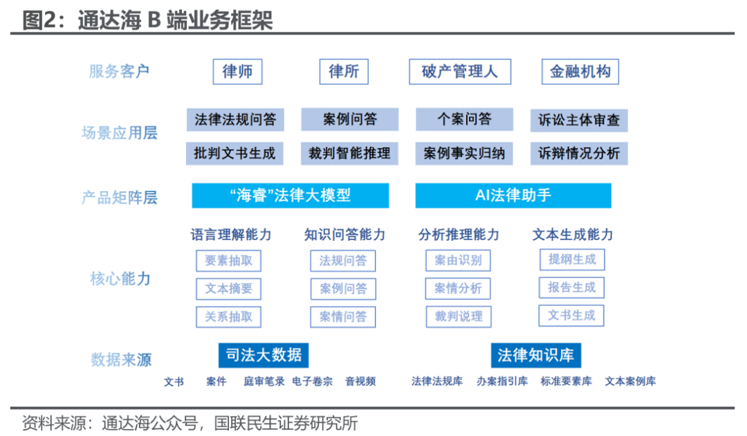 司法信息化龙头,坐拥G端数据护城河,全方位构建法律科技生态。通达海深耕司法信息化三十年,是国内法院核心业务系统的绝对龙头。公司智慧执行系统覆盖全国78.45%的法院,智慧审判系统覆盖率达28.22%,并深度参与最高法“一张网”顶层设计,构建了极高的行政准入壁垒与客户粘性。区别于普通AI厂商,公司拥有基于G端数十年沉淀的1.4亿 标准化文书案例与司法知识图谱,这构成了其不可复制的“数据底座”。在稳固G端基本盘的同时,公司将这种国家级的司法数据治理能力降维打击B端市场,打通了“法院-银行-律所”的数据闭环,形成了独特的“G B”双轮驱动生态。