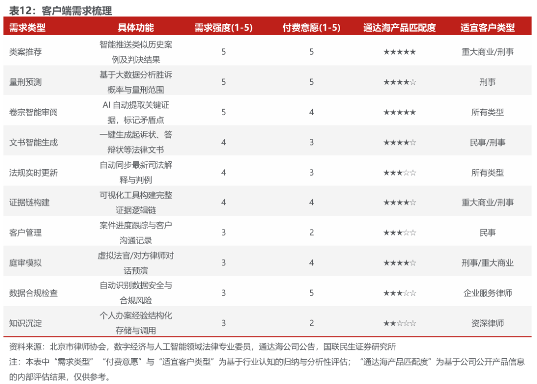 我们认为,律师对提升核心专业决策能力的付费意愿显著高于效率类辅助功能。从律师端细分需求看,需求强度最高的功能集中在类案推荐、量刑预测、卷宗智能审阅等直接影响案件判断质量的环节,而非客户管理、流程协同等通用型工具。
