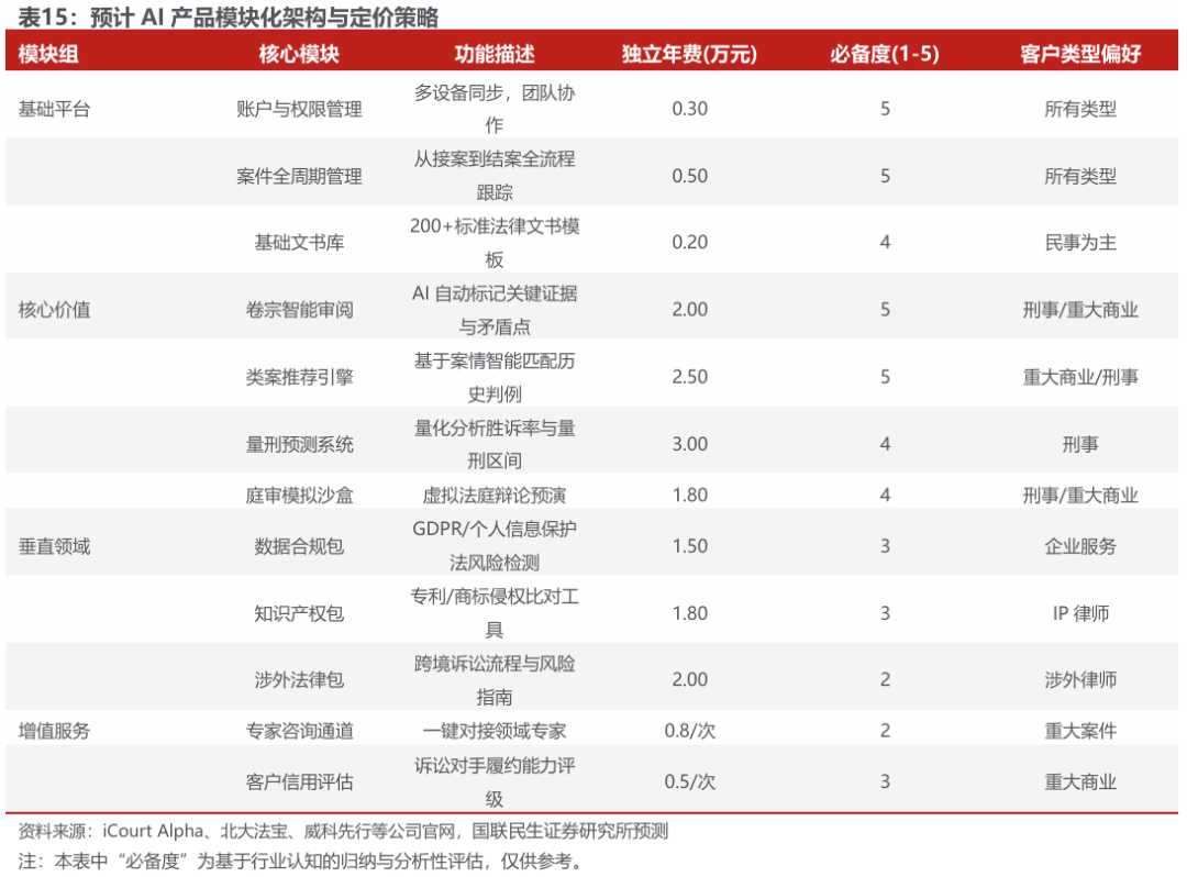 律师需求呈现"金字塔结构",高价值客户(重大商业/刑事)愿意为效率提升工具支付溢价,而民事律师更关注基础刚需功能。基础平台模块的功能覆盖面最广,具备较高必备度,但定价水平较低,主要服务于以民事诉讼为主的价格敏感型律师群体;随着业务复杂度与案件价值提升,律师对工具的需求逐步由流程管理、文书模板等基础能力,向直接影响案件判断质量与结果预期的智能化模块迁移。类案推荐、量刑预测及卷宗智能审阅等核心模块,因能够显著缩短案件准备时间、降低信息遗漏风险并提升决策确定性,在重大商业及刑事案件中体现出更高的使用价值和付费意愿,对应的定价区间和客户画像亦明显上移。