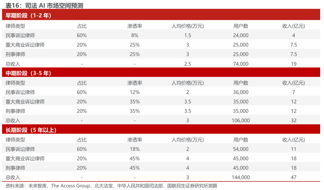早期阶段(1-2年):用户渗透期。收入主要由民事律师规模驱动,叠加少量高净值客户。预计覆盖7.4万用户,其中高价值律师(商业/刑事)渗透率约25%,对应营收约19亿元。