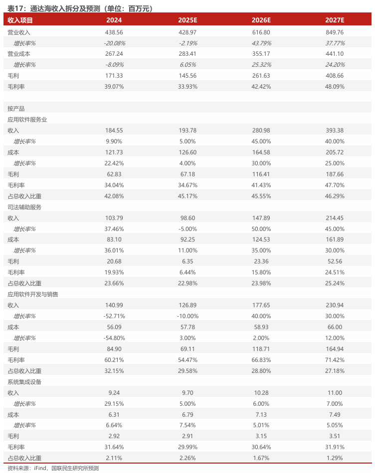 我们预计2025-2027年该业务收入分别为0.99/1.48/2.14亿元(增速分别为-5%/50%/45%)。随着公司司法辅助服务产品及解决方案逐步成熟,叠加智能化能力增强、服务附加值提升,预计未来毛利率呈上升趋势,2025-2027年毛利率分别为6%/16%/25%。