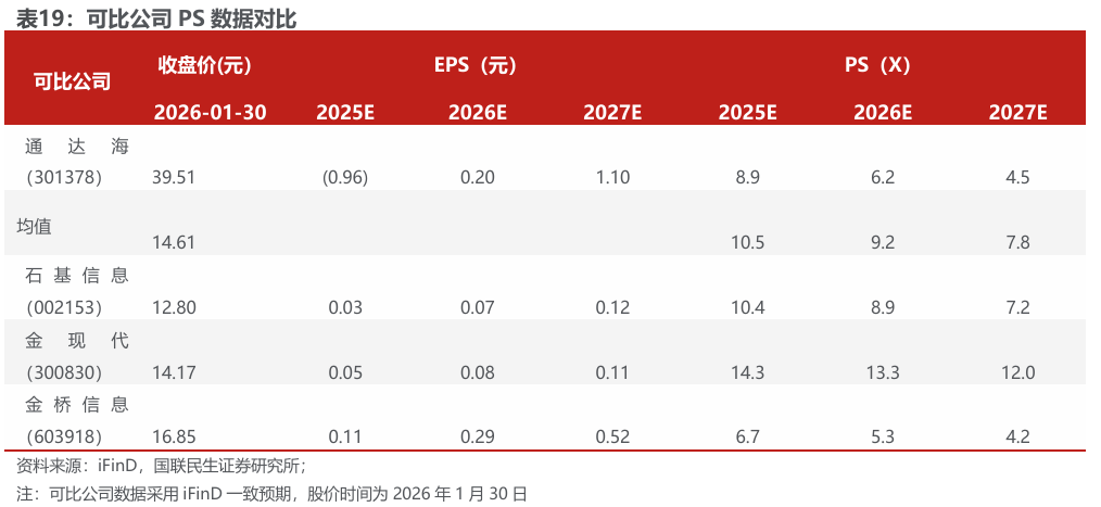 以2026年1月30日的收盘价计算,可比公司2025/2026/2027年的PS均值为10.5/9.2/7.8倍。我们预计公司2025/2026/2027年的EPS分别为-0.96/0.20/1.10元,当前股价对应PS估值分别为9/6/5倍,估值整体低于可比公司均值水平。