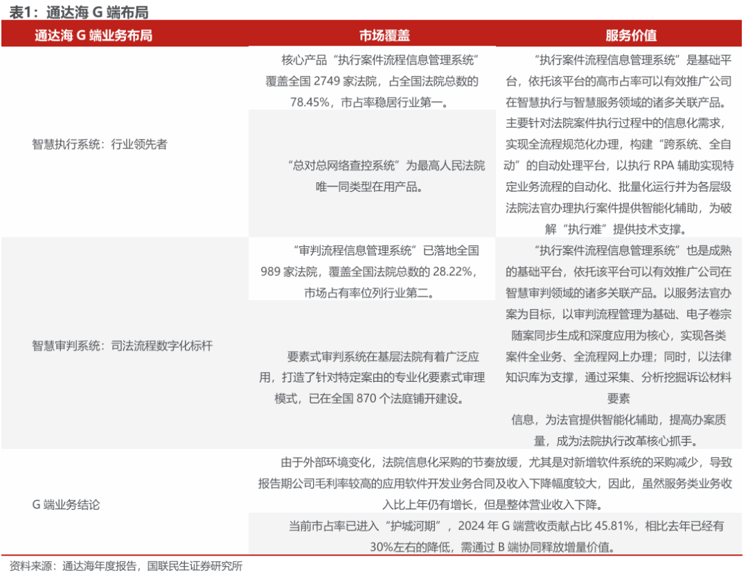 在这一背景下,通达海依托其在智慧执行系统与智慧审判系统中建立的先发优势与高市占率,已逐步构建起从核心系统到数据迁移、跨系统对接、持续运维的全周期服务能力。公司2023年至2025年间在深圳、陕西、山东、辽宁、武汉等多地中标的“一张网”相关项目,正是其系统整合能力获得法院客户认可的直接体现。尽管短期内行业采购节奏波动影响G端收入占比,但公司凭借在审判与执行两大核心场景中的卡位优势,持续向高附加值的系统集成与数据服务延伸,为其在全国司法一体化进程中占据领先地位奠定了坚实基础。
