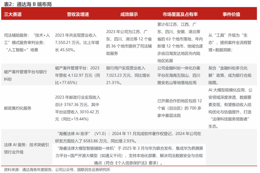 在司法辅助服务领域,通达海以“技术赋能 人工协同”模式深耕审判业务流程,不断拓展“人工智能 ”应用场景。该业务在服务于法院(G端)提质增效的同时,其积累的能力与平台更成为撬动B端市场的重要杠杆。2023年,公司司法辅助服务业务实现营业收入7,550.21万元,同比增长45.50%,这背后反映了B端客户对公司专业化服务能力的认可与采购的增长。服务地域已覆盖全国12个省份的63个地市,年内新增12个,均衡的全国性布局为公司向属地B端客户提供标准化、可复制的服务网络奠定了坚实基础。