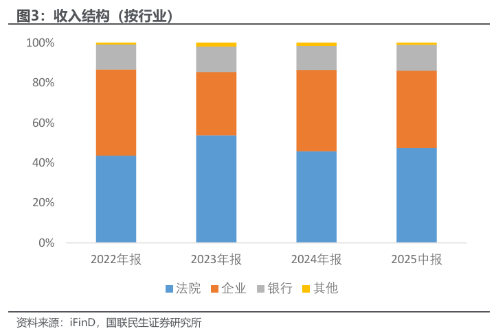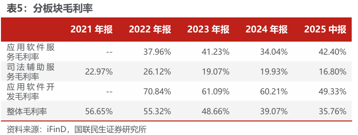 收入结构经历转型,营业收入略有下滑:2023年G端法院信息化收入占比约53.80%,2024年下降至45.81%,主要受外部环境变化及客户信息化预算影响,法院信息化采购节奏放缓,特别是新增软件系统的采购减少,2024年毛利润最高的应用软件开发收入14,098.92万元,同比下降52.71%。2023年企业及银行等B端业务收入占比约44.39%,2024年提升至52.67%(企业40.61% 银行12.06%),在2025年上半年进一步提升至51.58%(企业38.62% 银行12.96%)。