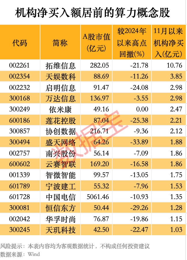 从资金面上来看,11月以来,共16股获机构净买入超亿元。机构净买入额最高的是拓维信息,达到10.76亿元,公司深入参与了长沙、重庆等多处人工智能计算中心建设,已中标全国一体化算力网络国家(贵州)主枢纽中心IT设备采购(一期)项目。