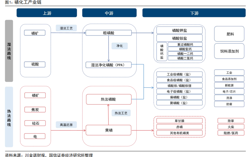 湿法磷酸为磷化工产业链核心制备路线。磷化工产业链包含湿法与热法两条核心技术路线,前者以无机酸分解磷矿石,设备简、能耗低但对磷矿品位要求高、产品杂质多;后者经黄磷加工制取,适配低品位磷矿、产品质量优但能耗高、成本高且尾气处理难度大。湿法磷酸或逐步替代高耗能热法工艺。