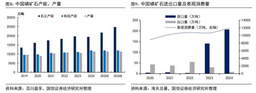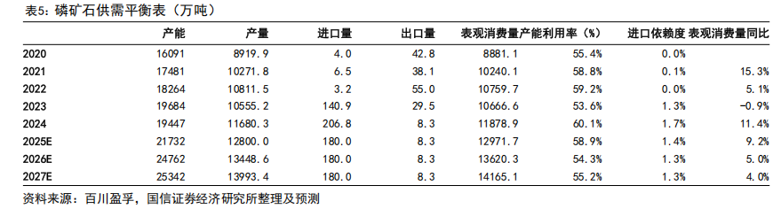 新增产能落地率或较为有限,进口难改紧平衡格局。尽管2025-2027年规划新增名义产能合计达0.59亿吨,但结合历史经验及当前政策环境、矿山开采难度及品位限制等情况,预计实际有效新增产能落地比例可能不足40%,即三年仅约0.24亿吨以内能形成真实供应。与此同时,进口虽在2024年增至207万吨(同比 46.8%),但占消费比重仍低于2%,且受内陆主产区运输成本制约,进口矿难以形成有效补充。综合来看,2025-2027年磷矿石表观消费量或将稳步升至1.42亿吨,而有效供给增速有限,供需紧平衡格局和价格高位运行态势有望持续。