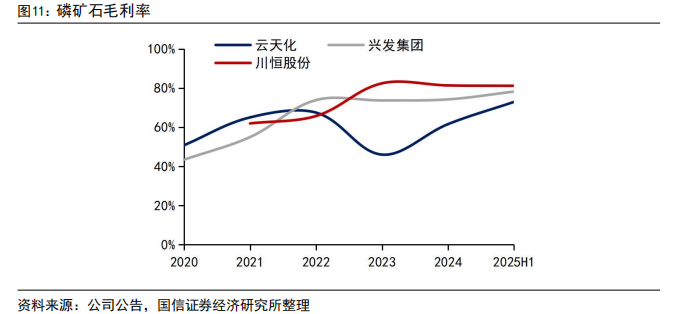 磷矿石毛利率保持较高水平。川恒股份的磷矿石毛利率在2023年超过80%并维持高位,其在磷矿资源布局、成本控制或产品结构上有较强优势;兴发集团毛利率稳步提升。2025年上半年,川恒股份、兴发集团、云天化的磷矿石毛利率均处于80%左右的高毛利水平。具备自有矿山、高品位磷矿储备及产业链协同的企业盈利能力更强,磷矿石业务为头部磷化工企业的重要利润支撑点。
