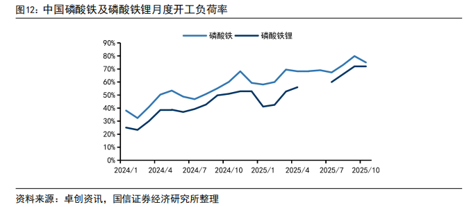 2025年下半年,锂电行业呈现显著的复苏态势,全产业链排产与开工率稳步提升。据卓创资讯,磷酸铁开工率从1月的58%升至10月的75%;磷酸铁锂开工率由1月的41%升至10月的72%;六氟磷酸锂开工率同步从43%跃升至80%。伴随产能释放,产品价格强势反弹,六氟磷酸锂价格从年初6万元/吨飙升至12月的约17万元/吨,磷酸铁锂价格也由3.6万元/吨涨至超4万元/吨,反映下游需求持续向好。旺盛的含磷材料需求进一步传导至上游,拉动磷矿石及高纯磷酸等原料的消费,支撑磷化工产业链景气度回升。