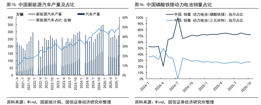 新能源车与储能双轮驱动,贡献磷矿石重要下游增量。近些年来,在国内相关政策支持、锂电技术进步、消费者对新能源汽车接受程度提高等背景下,我国新能源汽车产业快速发展,据国家统计局数据,截至2025年10月底,我国汽车产量2287万辆,其中新能源汽车产量1080万辆,占比47%。2024年我国磷酸铁锂电池在动力电池领域市占率达68%;凭借高温下结构稳定、安全性高、循环寿命不低于15年等优势,磷酸铁锂电池在储能领域占据垄断地位。受益于新能源汽车市场快速增长与储能领域持续扩展,我国锂电池产量规模不断扩大,带动磷酸铁锂正极材料出货量大幅攀升,根据则言咨询数据,2024年出货量达244.5万吨,同比增长54.1%,较2020年的16.35万吨增长超14.95倍。
