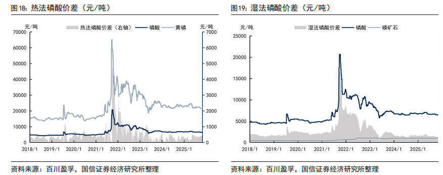 磷酸价格经历2018-2021年温和上行,受环保限产与需求回升推动;2021-2022年爆发式上涨,因新能源拉动及供应紧张,磷酸价格一度突破2万元/吨;随后进入2022-2025年下行通道,产能释放叠加需求放缓,价差持续回落并趋于稳定。