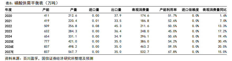 磷酸供需格局总体趋紧。2020-2024年,中国磷酸表观消费量由174.6万吨快速增至296.1万吨,年均增速达14%,主要受益于新能源材料(尤其是磷酸铁锂)需求爆发及磷化工产业链扩张;同期产能从411万吨增至654万吨,产量提升至331万吨,产能利用率维持在45%-53%区间,显示供给响应积极但未明显过剩;进口依赖度始终为零,出口稳定在33-45万吨,整体以自给自足、内需主导。展望2025-2027年,基于当前供需情况及项目规划,表观消费量预计继续高增,2025年同比增速或达30%,产能利用率有望稳步提升,新能源拉动逻辑仍将持续,供需格局总体趋紧。