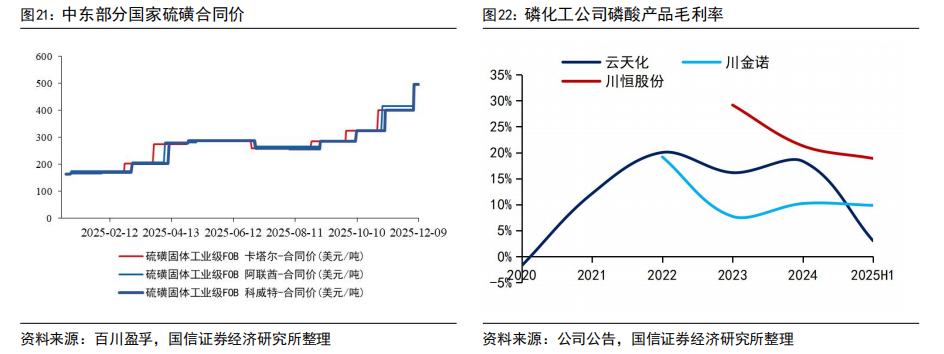 成本端硫磺供需偏紧,地缘冲突加剧供给紧张,价格快速上涨。硫磺主要伴生于油气开采及炼化,未来油气消费增速下降,高硫原油生产有所下降,全球硫磺产量增速预期较低。硫磺最重要应用为制备硫酸,硫酸需求预计仍将保持中速增长,拉动硫磺需求增长,综合来看全球硫磺供需偏紧。俄罗斯本为全球第二大硫磺生产国,2025年来其炼厂持续受袭,直接影响了气硫磺的生产和出口,加剧硫磺供应紧张。市场目前已经接受俄罗斯硫磺出口降低的现状,但随着冲突的持续进行,经俄罗斯出口的部分中亚国家生产硫磺供应有受阻风险。市场更加青睐供应稳定的中东硫磺,这进一步推高了中东硫磺价格。2025年初中东硫磺合同价为163-165美元/吨,年末中东多个国家分别上调了硫磺12月份官方合同价格至495美元/吨,折合人民币到岸价约4250元/吨左右。