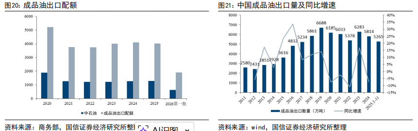 我国成品油出口实行配额制度,中石油等主营炼厂出口指标较为充足。我国成品油出口采取配额制度,2019年前,为了化解炼化产能过剩压力,出口指标不断提高。“十四五”以来炼油行业调整力度不断加深,为了扭转大量进口原油且大量出口成品油的现状,我国出口配额下降后保持在约年均4000万吨出口体量,仍能在一定程度上缓解我国成品油产量过剩压力。2025年我国下发4019万吨成品油出口配额,中石油获得1285万吨,2026年第一批成品油配额下发总额为1900万吨,中石油获得620万吨。以中石油为代表的主炼企业手握较充足指标,可以积极利用国内外价差空间进行套利。