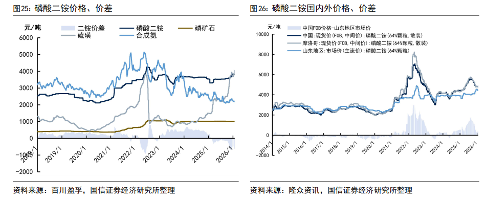 出口政策影响市场,近年来海内外价差两度走阔。出口政策影响市场,海内外价差走阔。2021-2022年,在全球粮食安全担忧、化肥需求激增背景下,叠加中国阶段性出口放行,国际价格(波罗的海FOB)飙升至7000元/吨以上,显著高于国内,价差一度扩大至超过3000元/吨。2022年下半年起,尽管中国实施严格的磷酸一铵出口法检与配额限制,但国际价格仍持续回落,主因全球供需格局逆转,摩洛哥、沙特等非中国主产国产能加速释放,填补供应缺口;同时,高粮价和化肥成本抑制下游采购意愿,叠加欧洲能源价格大幅回落,削弱成本支撑,共同推动国际价格从高位下行。然而,自2024年以来,国内外价差再度显著扩大,高峰期差距约至2000元/吨。这一轮价差走阔的核心原因正是中国持续的出口总量控制政策,在“国内优先、适当出口”原则下,出口配额集中于5-9月且总量受限,导致国内大量产能转向内销,压制国内市场价格;而国际市场因俄乌冲突持续、俄罗斯磷肥出口受阻、南美及印度库存低位补货需求旺盛,价格维持高位,也使拥有出口配额的企业显著受益。
